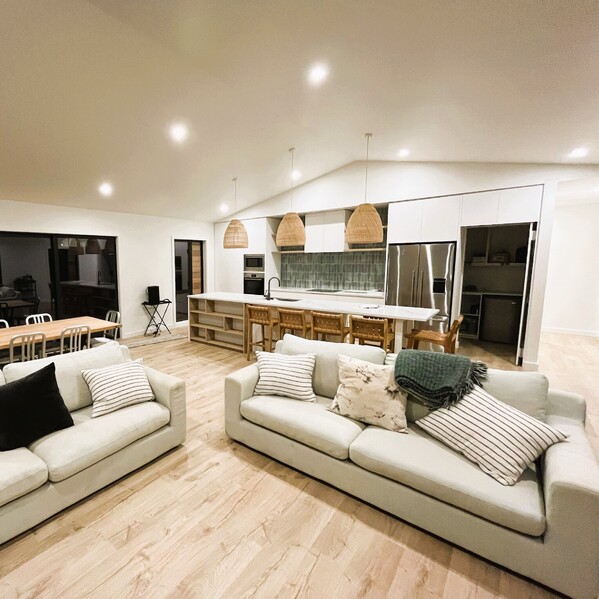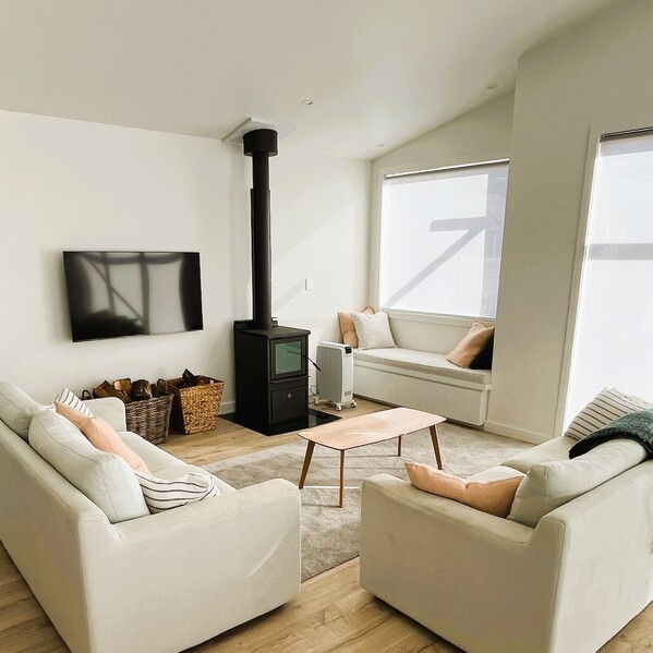 The house features 3 large bedrooms, 2 bathrooms, separate toilet, contemporary kitchen with scullery and separate laundry room. The main living area, and entertaining hub of the home, can be set up into two distinct zones - one area for watching TV or relaxing on the corner window seat in front of the fire, and the other for socialising or enjoying the views from the huge stacker doors on either side of the room.