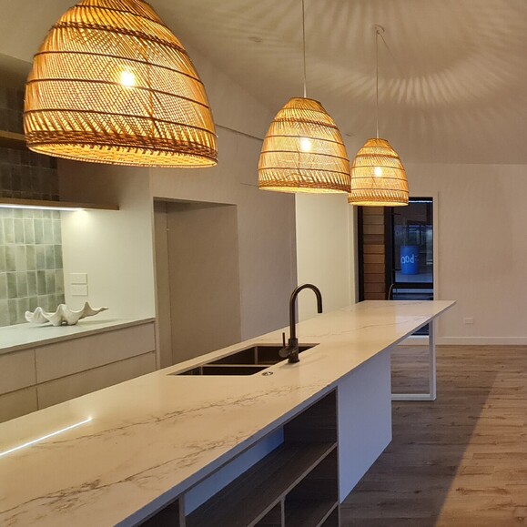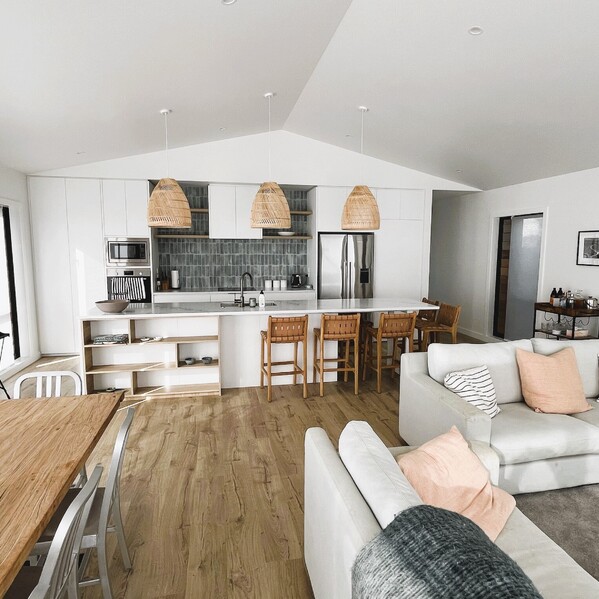 In the kitchen, the rattan pendants, ocean-wash tiling, and the white-on-white cabinetry are reminiscent of a bright and breezy coastal retreat and the extra-long- engineered stone island benchtop, invites casual, beach- style dining.