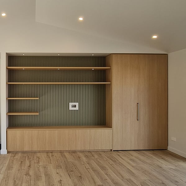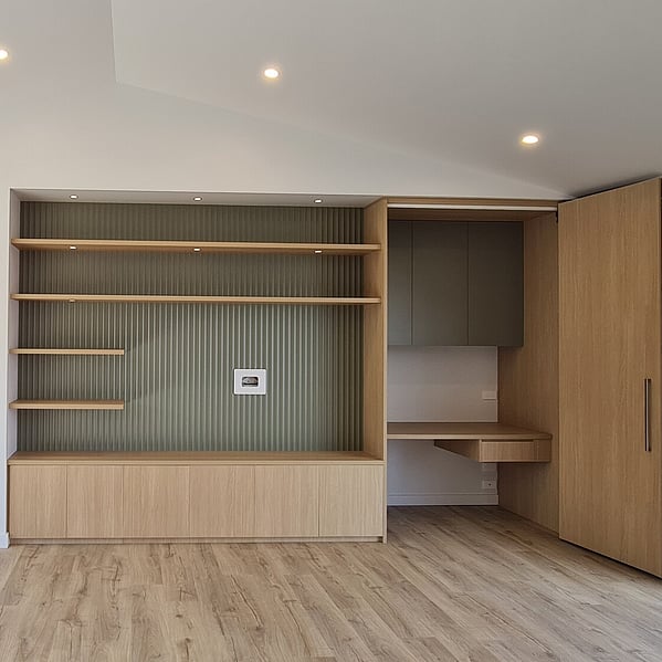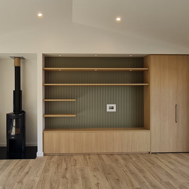 While the Barn 114 provides a strong starting point, this home includes a number of considered changes that reflect how the clients wanted to live in the space. One of the most significant was relocating the laundry from behind the entertainment wall to a position behind the scullery, opposite the back door for everyday practicality. This change allowed for a dedicated office alcove within the living space, a larger ensuite shower, and the addition of a freestanding wood burner at the opposite end of the entertainment wall, ideal for cooler Coromandel evenings.