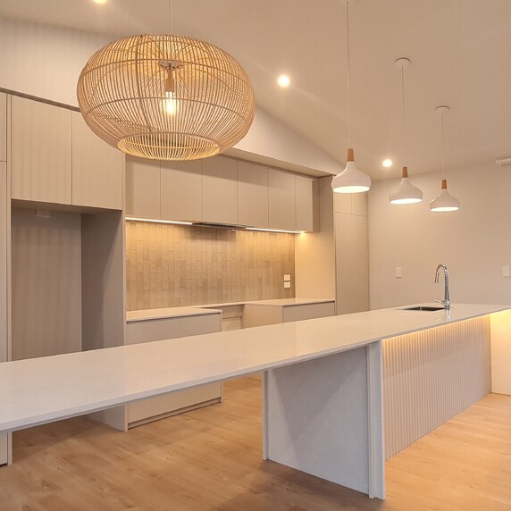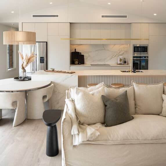 The open plan living and dining area boasts a large panoramic sliding window and a 5.5m wide stacker door for excellent indoor/outdoor flow. A custom inbuilt entertainment unit in the main living area is always client favourite, combining style, functionality, and hidden storage.