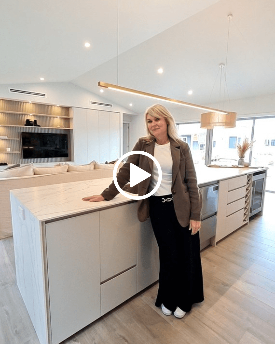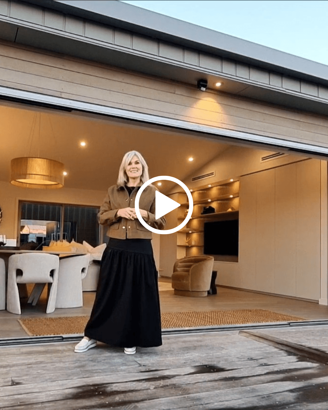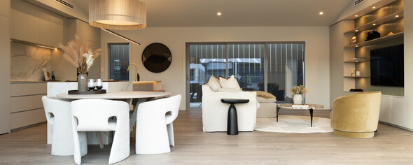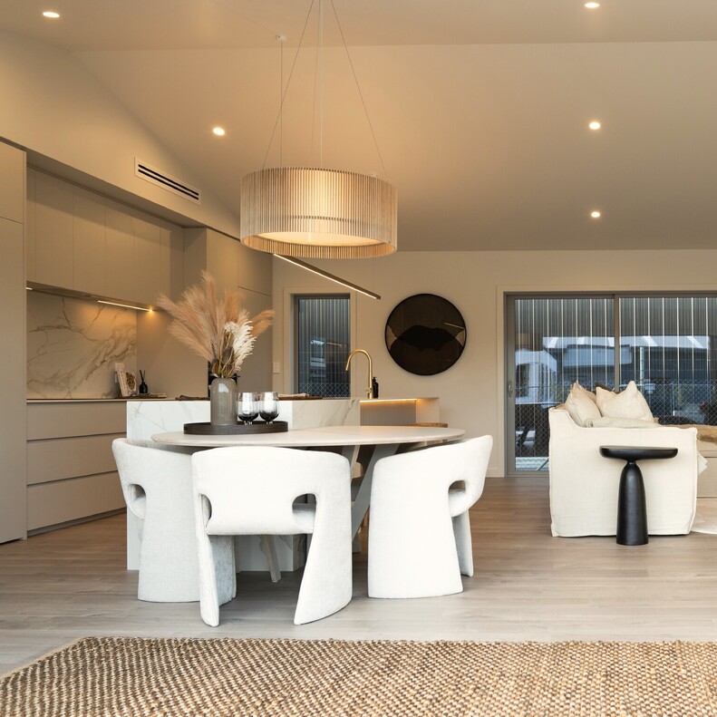 The open plan living and dining area boasts a 5.5m over wall stacker door that opens completely, allowing seamless indoor/ outdoor flow. The stacker door positioned opposite further promotes the illusion of bringing the outdoors in.