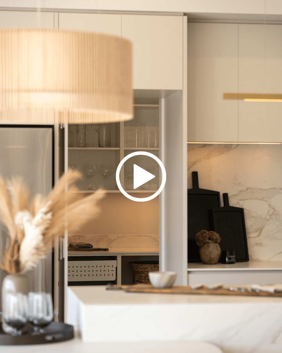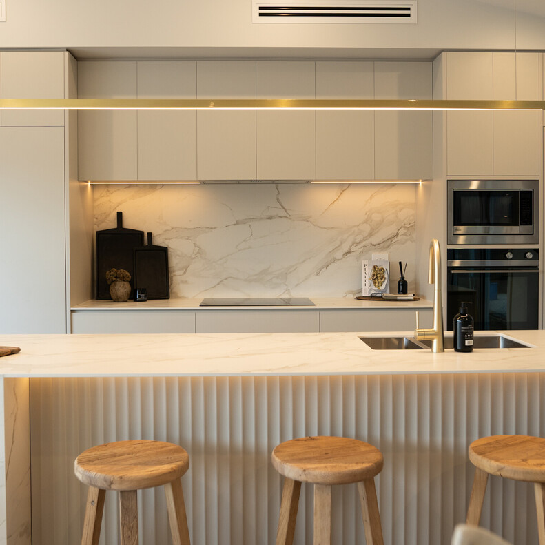 Custom-made kitchen with brushed brass accents and negative detailing, finished with stunning extra-long Dekton bench tops and splashback. The block island bench features waterfall ends and a bespoke dining table extension which makes a striking - and space-saving - statement.