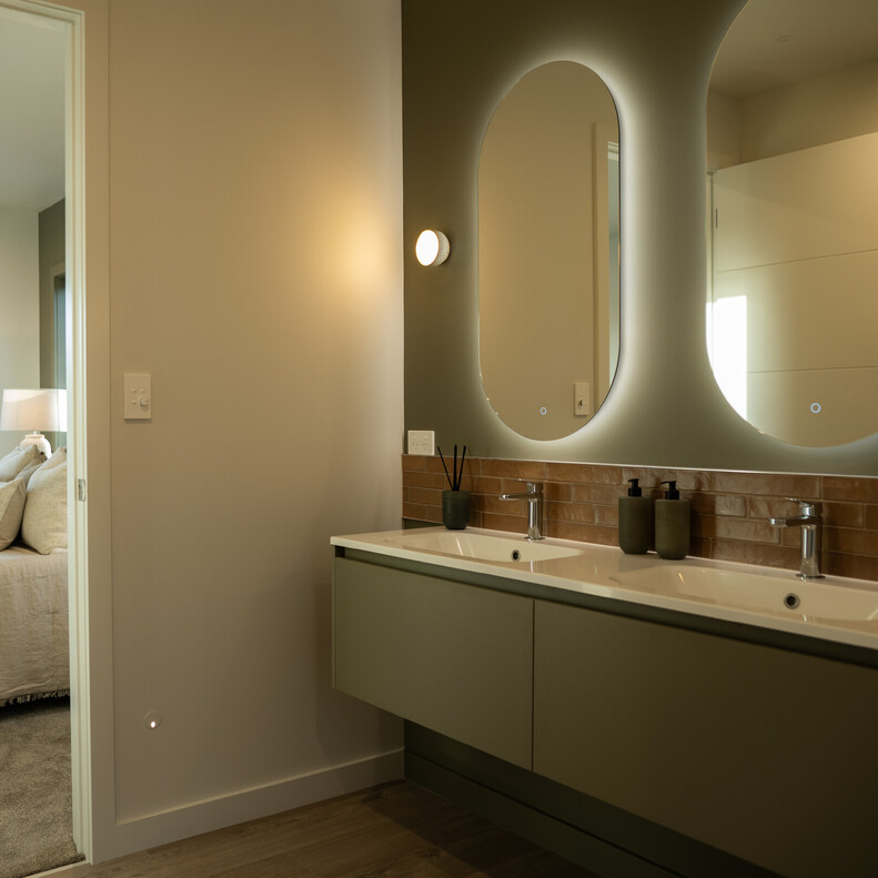 Feature lighting, for that extra dash of ambiance, includes designer pendant lights over the island bench and dining table, LED surround mirrors in the bathrooms and extra designer wall lighting in the ensuite, recessed LED ceiling lights and touch activated under cabinetry mood lighting throughout.