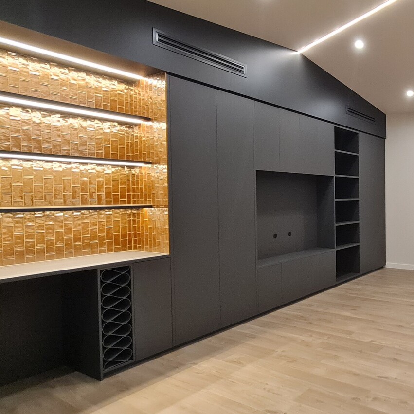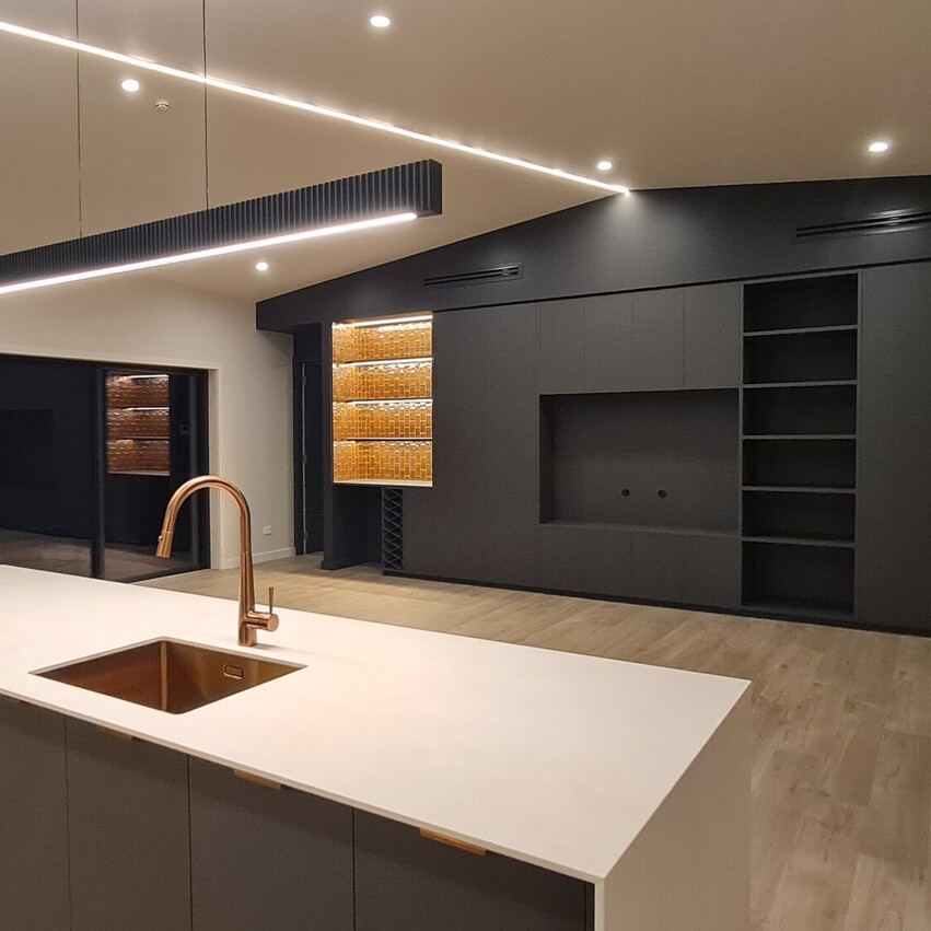 The interior boasts a moody, elegant colour palette, with opulent bronzed accents highlighting the bespoke inbuilt bar, the kitchen sink, coordinating faucet and the cabinetry handles. Special attention has been given to the lighting throughout the home. Designer pendants, feature wall lights, LED strip lighting and dimmable options allow for a customizable ambiance. The main living area features a high, angled ceiling with LED strip lighting creating a sense of volume and airy openness.