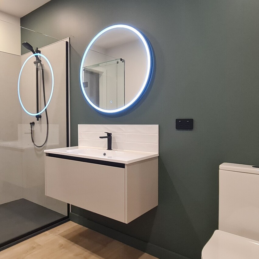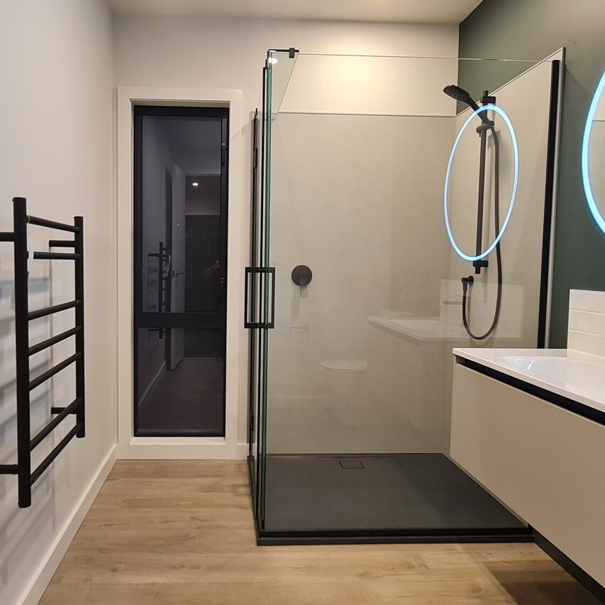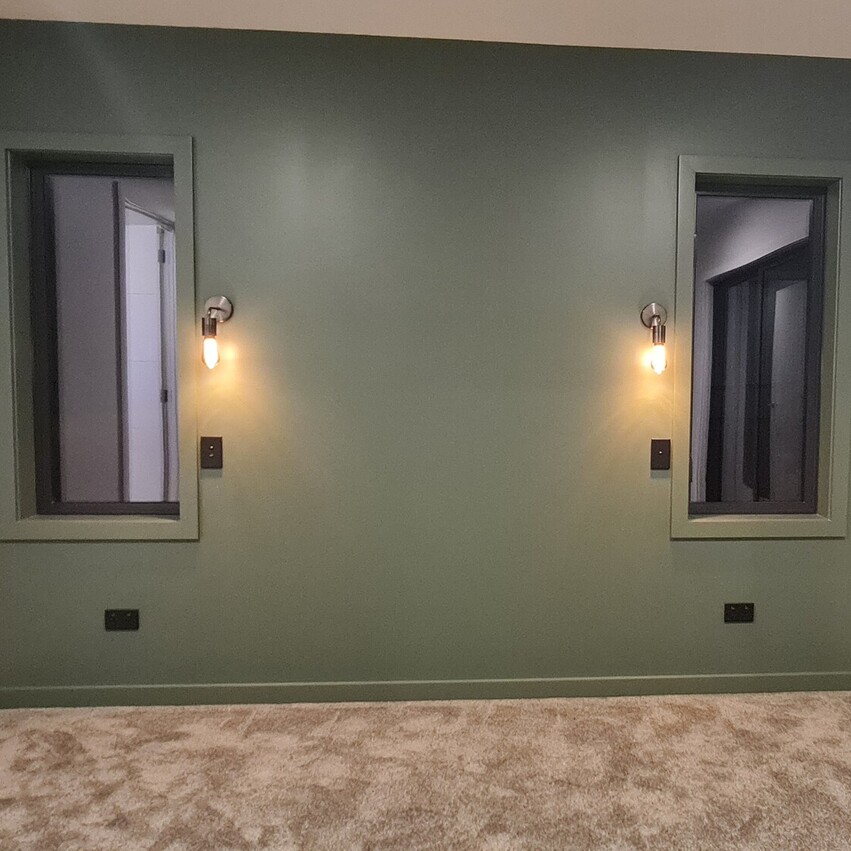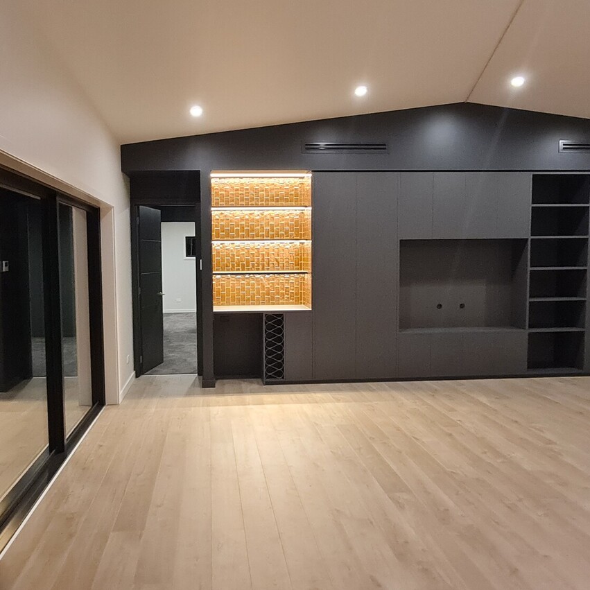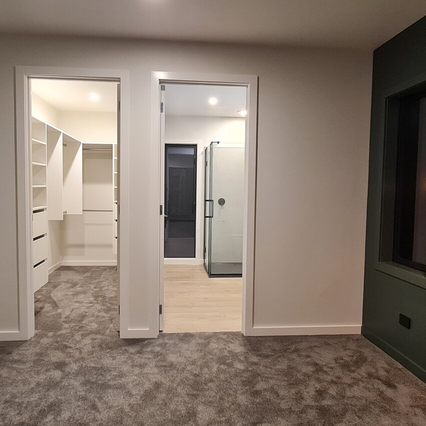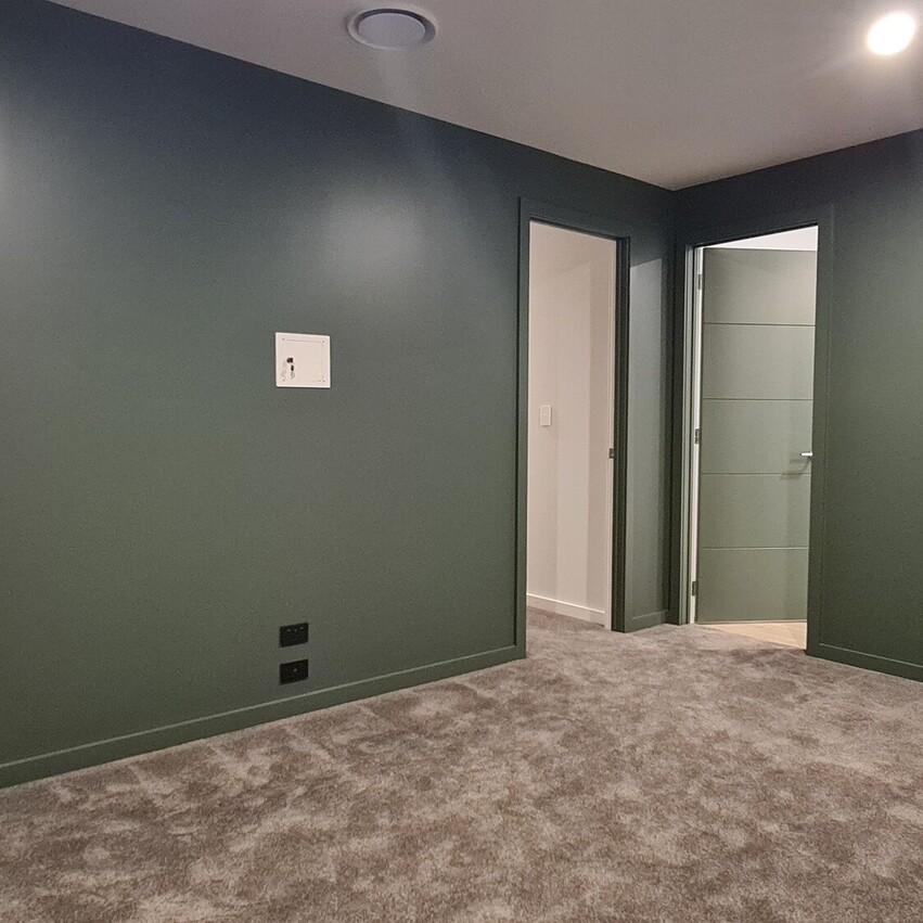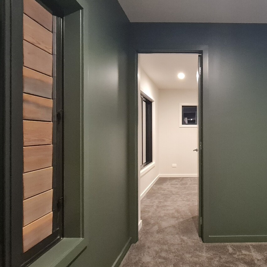 In contrast, the second living end of the house is painted a deep forest green, offering a cozy, intimate atmosphere, the perfect spot for relaxation. Off the lounge area there are two roomy bedrooms, which comfortably fit king-sized beds and both rooms feature floor to ceiling, 3-bay inbuilt wardrobes. Also conveniently located at this end of the home is a contemporary bathroom with matte black fittings, a large 1.2m shower, sleek vanity with hidden storage and LED surround mirror.
