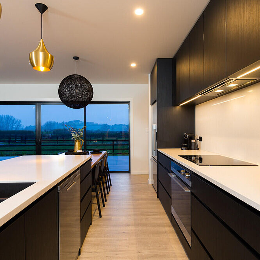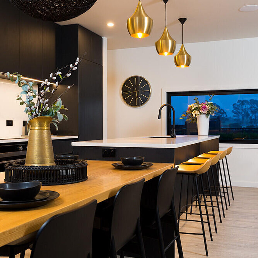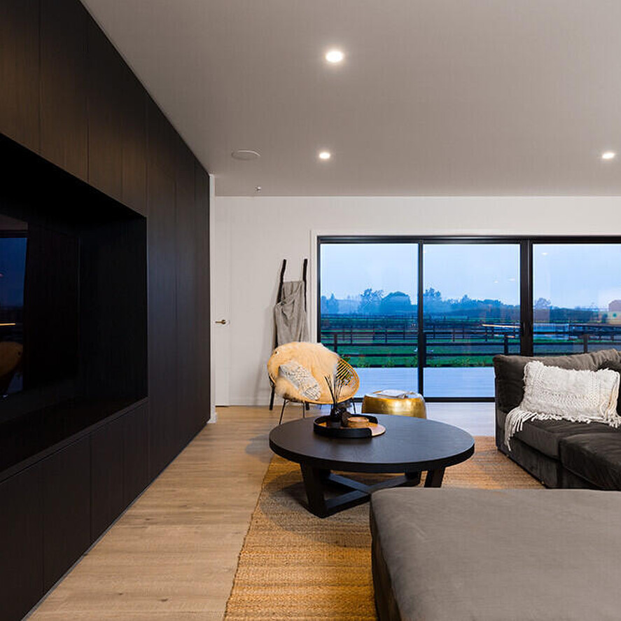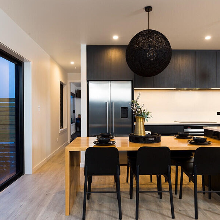The striking ebony iron and manuka stained cedar exterior, complement our client's stunning selection of luxurious interiors. The kitchen, as the focal point of the main living area, is both smart and sophisticated with a solid timber American White Ash waterfall dining table, Primestone marble bench tops and black puregrain kitchen cabinetry.
