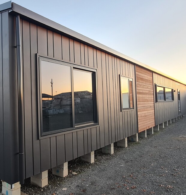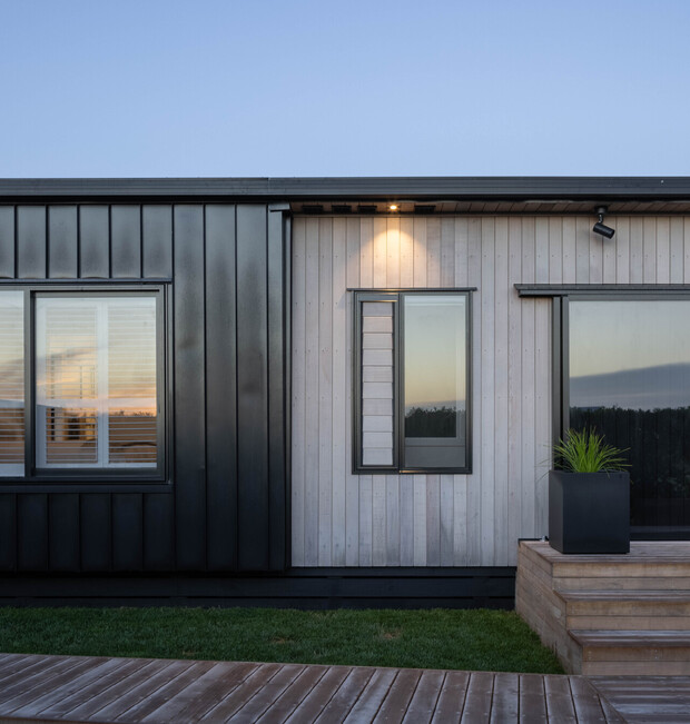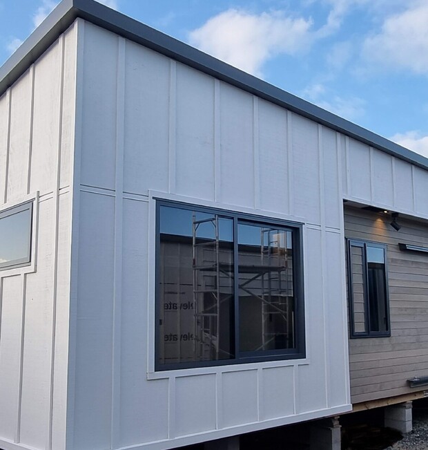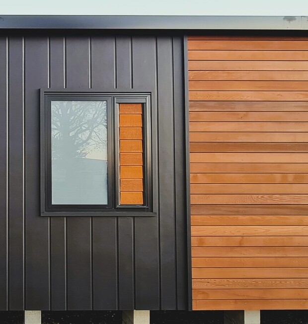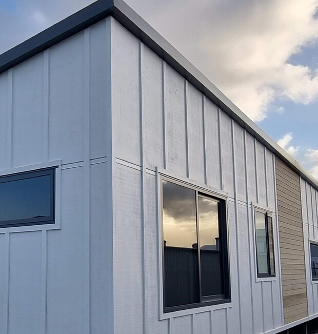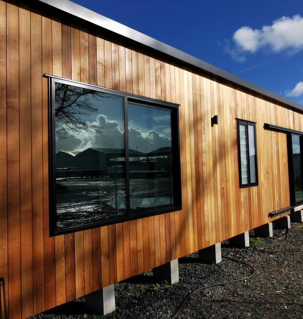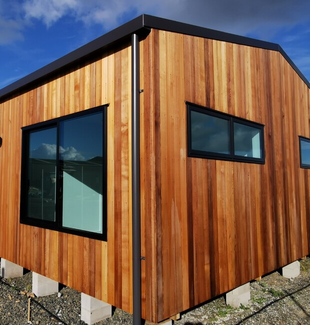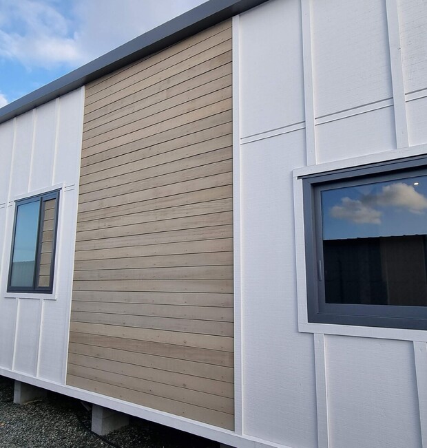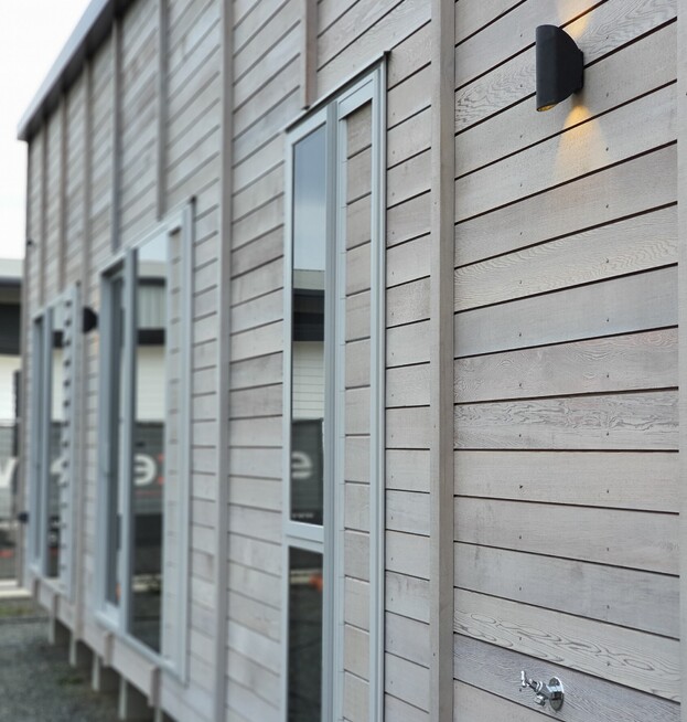 The NEW exterior cladding combination we now use as standard on our iconic Elevate homes is Linea Oblique shiplap weatherboard (laid vertically) with stained cedar rusticated weatherboard (laid horizontally).