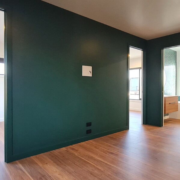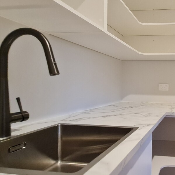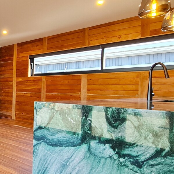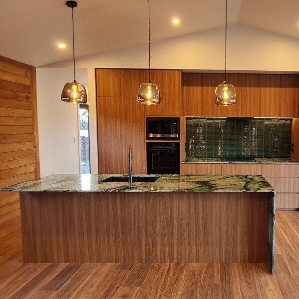 A striking natural stone benchtop in rich, vibrant green -Verde Lapponia, a quartzite from Lapland - was chosen by Steve, a retired geologist, and is the heart of the home.