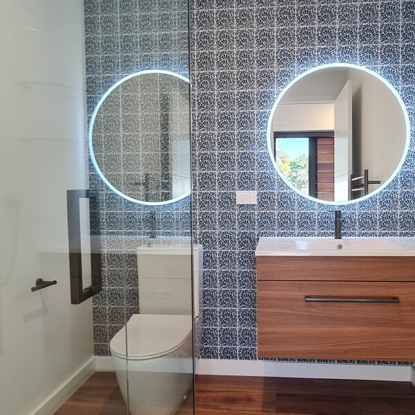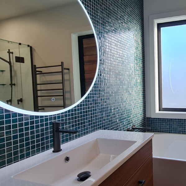 Stylish bathrooms featuring textured tiles, gunmetal tapware, LED mirrors—and a full-sized bath for soaking in the view.