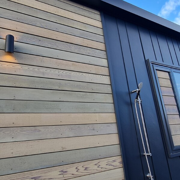A handcrafted timber feature wall, made from King Country Rimu milled in the 1950s and salvaged from the couple’s original family Bach - restored with care and left in its beautifully raw state.