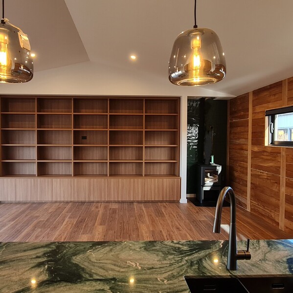A wall of bespoke bookshelves, designed to showcase the couples’ extensive book collection, paired with a contemporary wood burner and tiled alcove - perfect for curling up with a good read on a rainy Raglan afternoon.