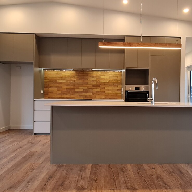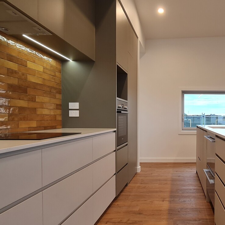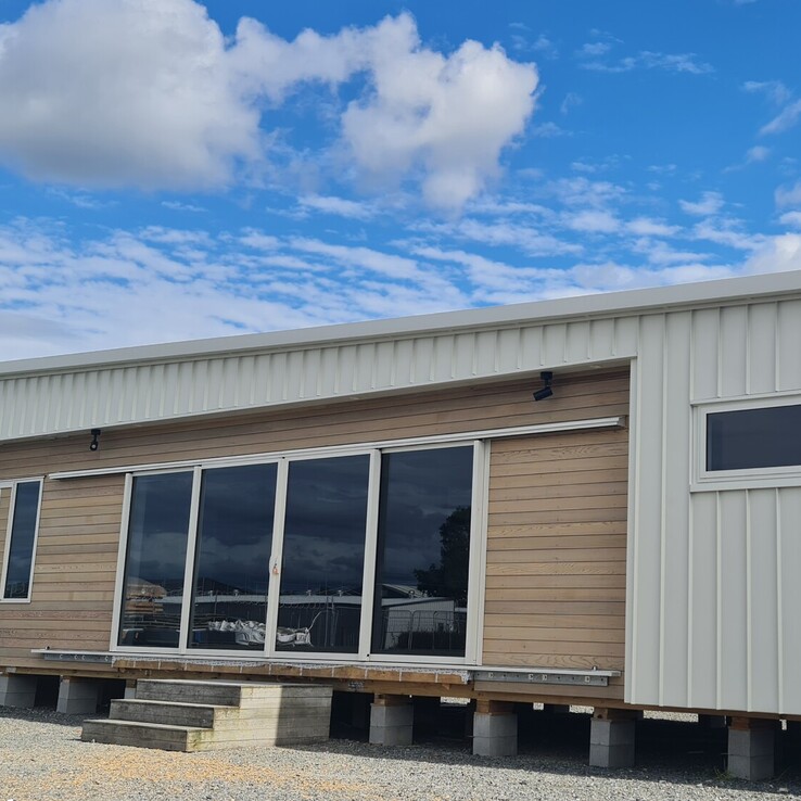 This Elevate Tilt 130 home was designed for the exclusive Rangitahi Peninsula in Raglan. The exterior Scandi inspired colour palette carries through into a clean and contemporary interior colour scheme and décor. Warmth and vibrancy were added throughout with sage green and misty grey tones in the kitchen and entertainment area, and a striking honey gloss splashback in the heart of the home.