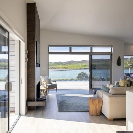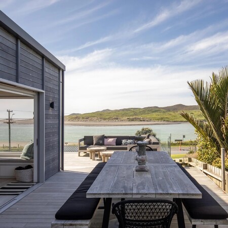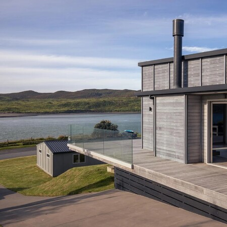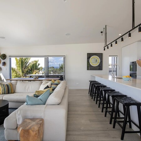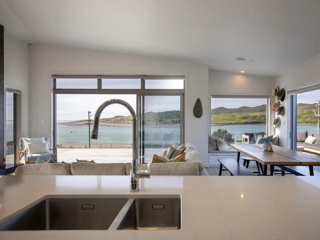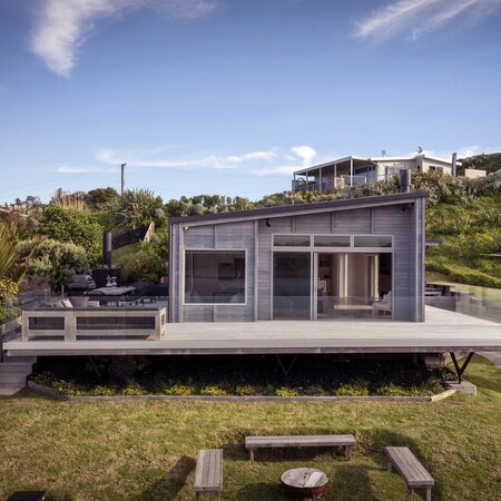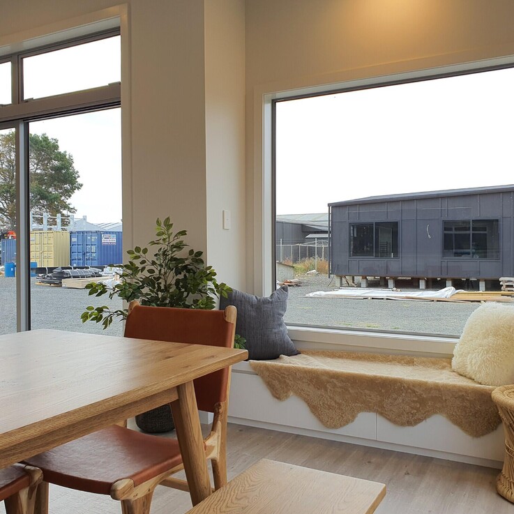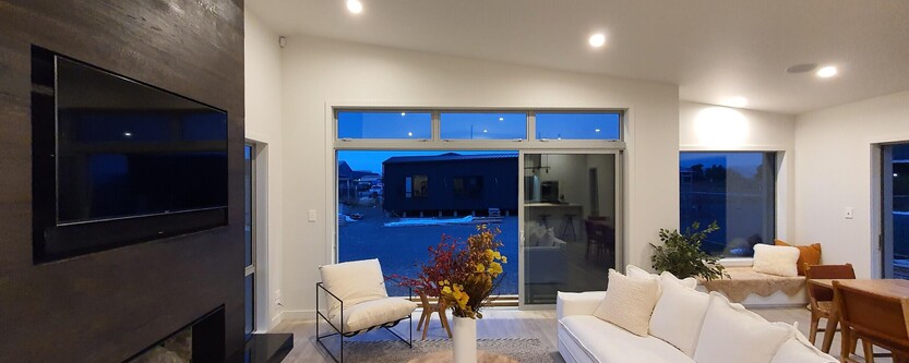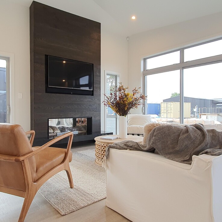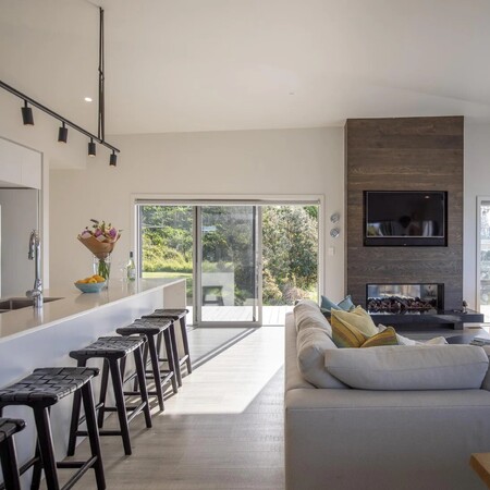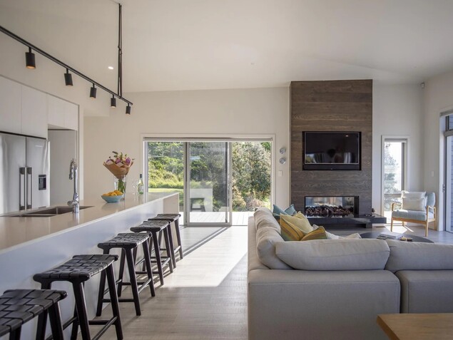 This Elevate Tilt 145 home was designed for the rugged Raglan coastline with the interior featuring a soft coastal theme, with rustic accents thrown in, in the form of a beautiful bespoke timber fire surround and rusted metal kitchen splash back.