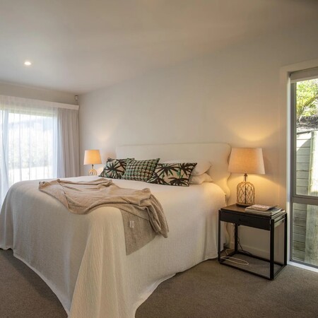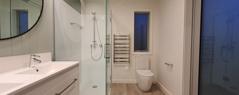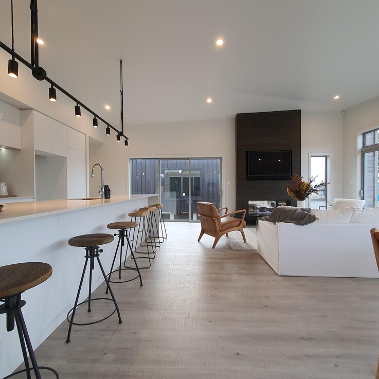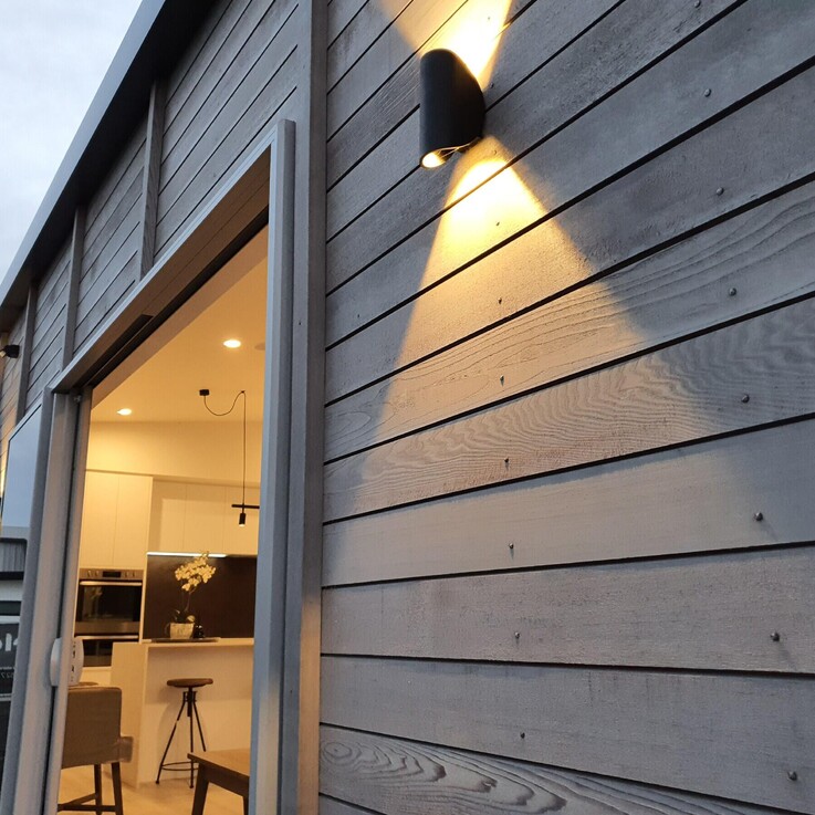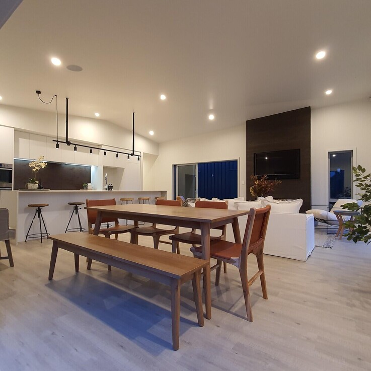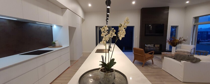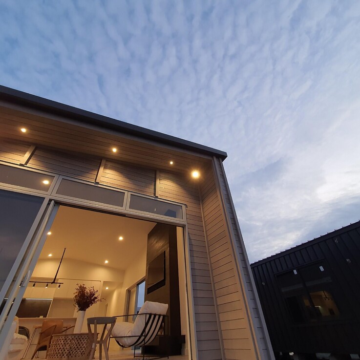 Although based on the Elevate standard Tilt 145 plan, this home was customized to reflect the location and lifestyle of the owners. Details such as an extra-long island bench for entertaining, exterior doors leading from both the ensuite and bathroom to the spa pool and sliding doors leading from the bedrooms to the deck – were all features used to make this house feel like a home designed with their needs in mind.