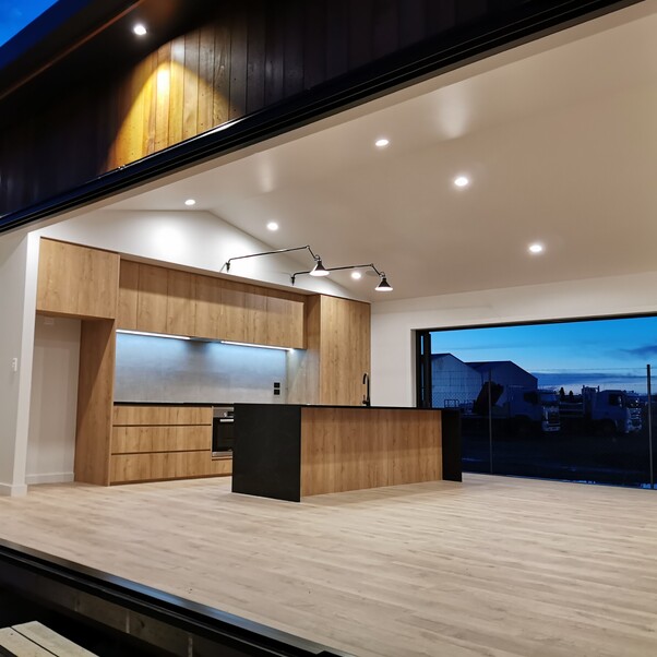 The large open plan living, kitchen and dining area with oversized exterior stacker doors on either side, provides a spacious and airy hub to the home, where the family meet and make the most of the amazing views and indoor/ outdoor flow.