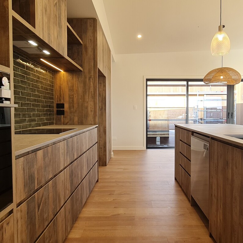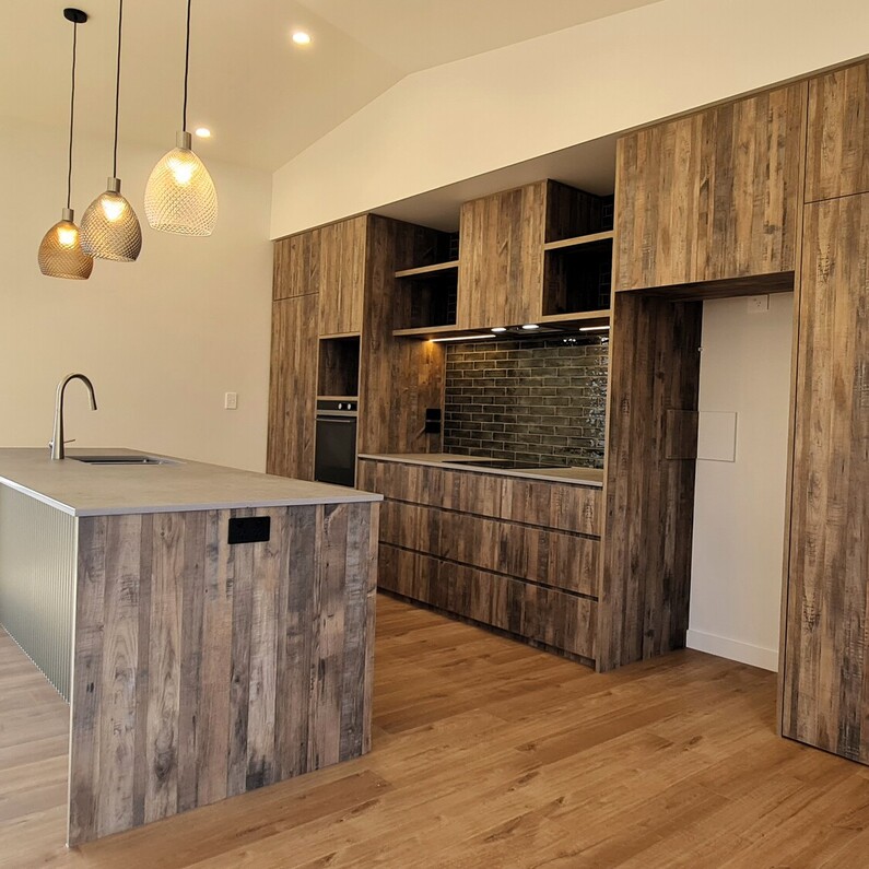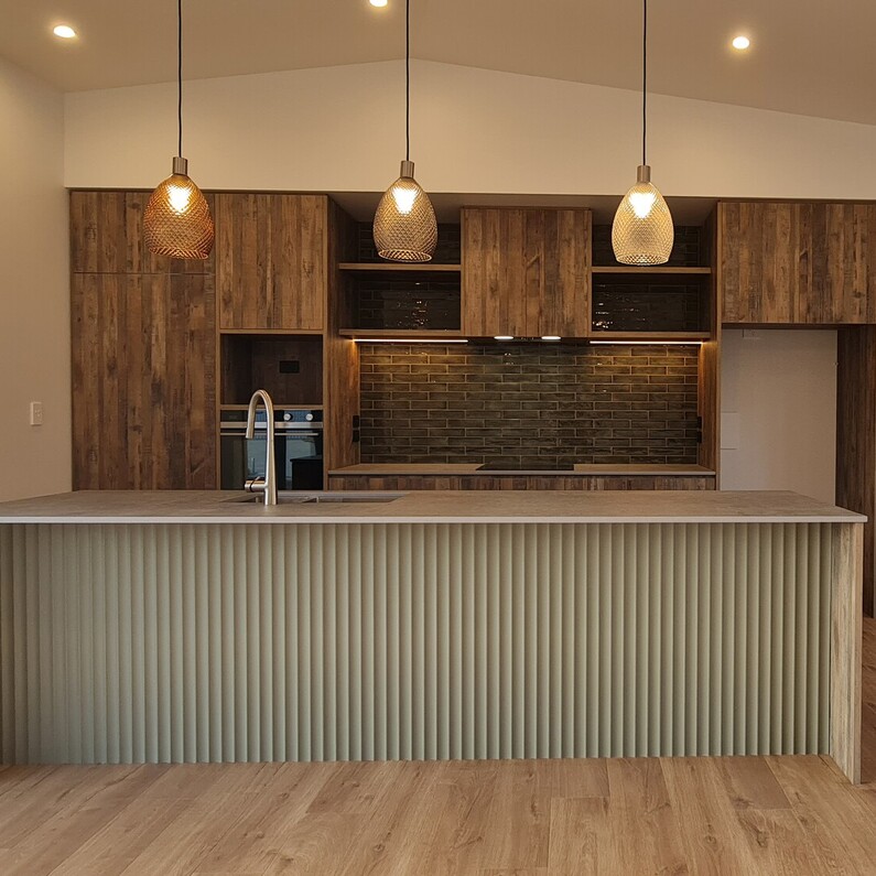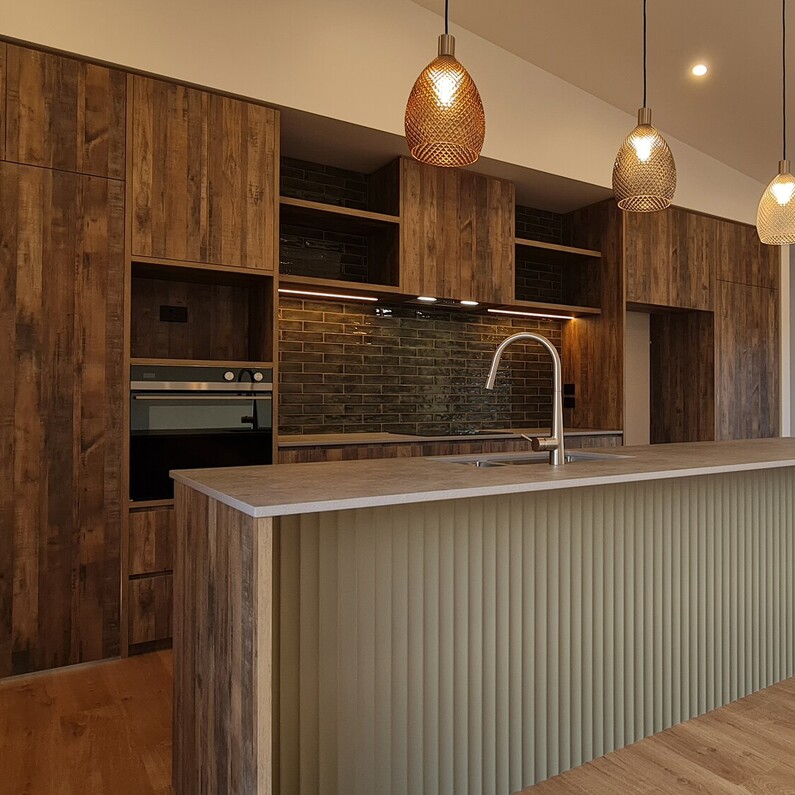 The kitchen embraces a bold, rustic palette with salvaged planked elm Melteca cabinetry, an earthy green scalloped island bench backing, sage green splashback tiles, and brushed nickel fixtures. The layout closely follows our popular Elevate 150 kitchen plan, designed for easy everyday living and effortless entertaining.