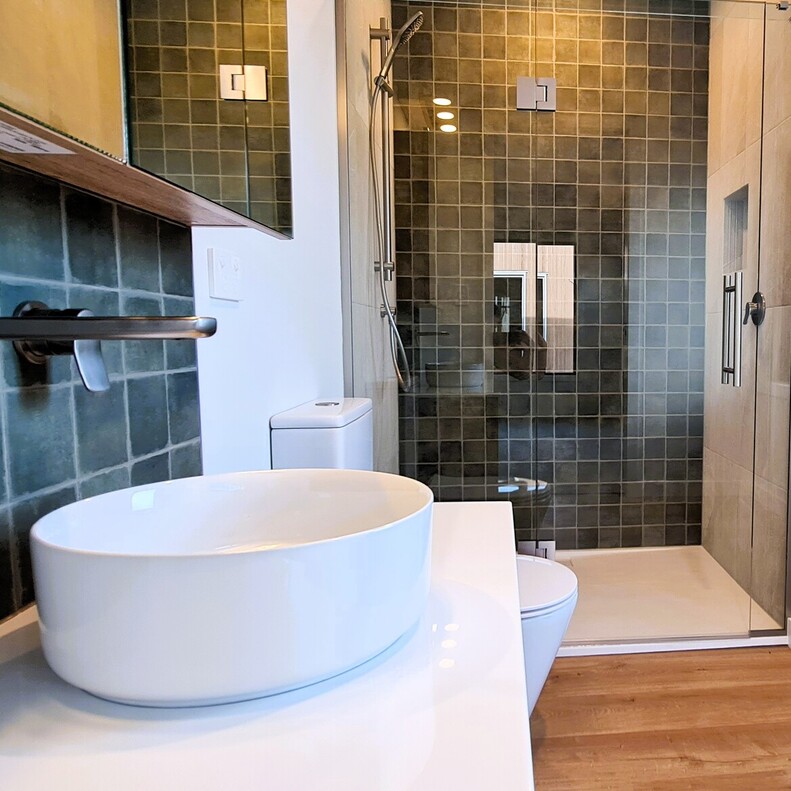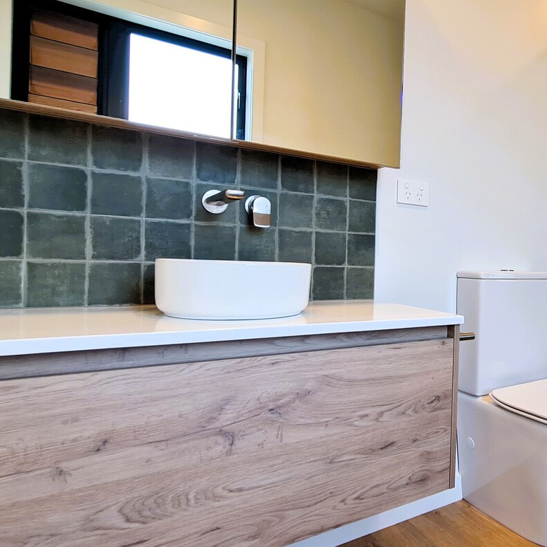 The home’s earthy green tiles and brushed nickel fittings flow through to the bathroom and ensuite, tying the palette together beautifully. Both spaces feature fully tiled showers, wall-hung vanities, oak-interior mirrored cabinets, and elegant Travertine feature lights in natural stone and timber for a soft, organic touch.