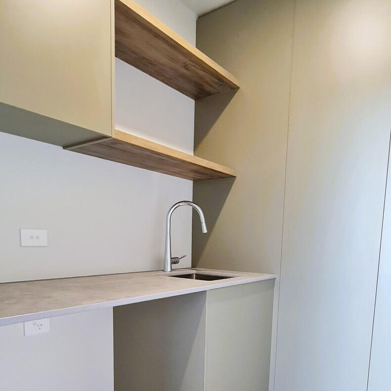 Concealed behind integrated cabinetry doors off the kitchen are the highly functional scullery and laundry. The scullery includes open shelving, under-bench cupboards, two large ventilated drawers, a sink, and a gooseneck pull-out tap – creating an efficient workspace with ample storage.